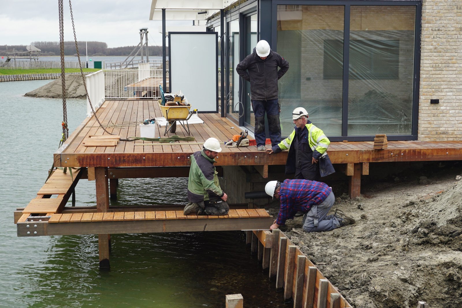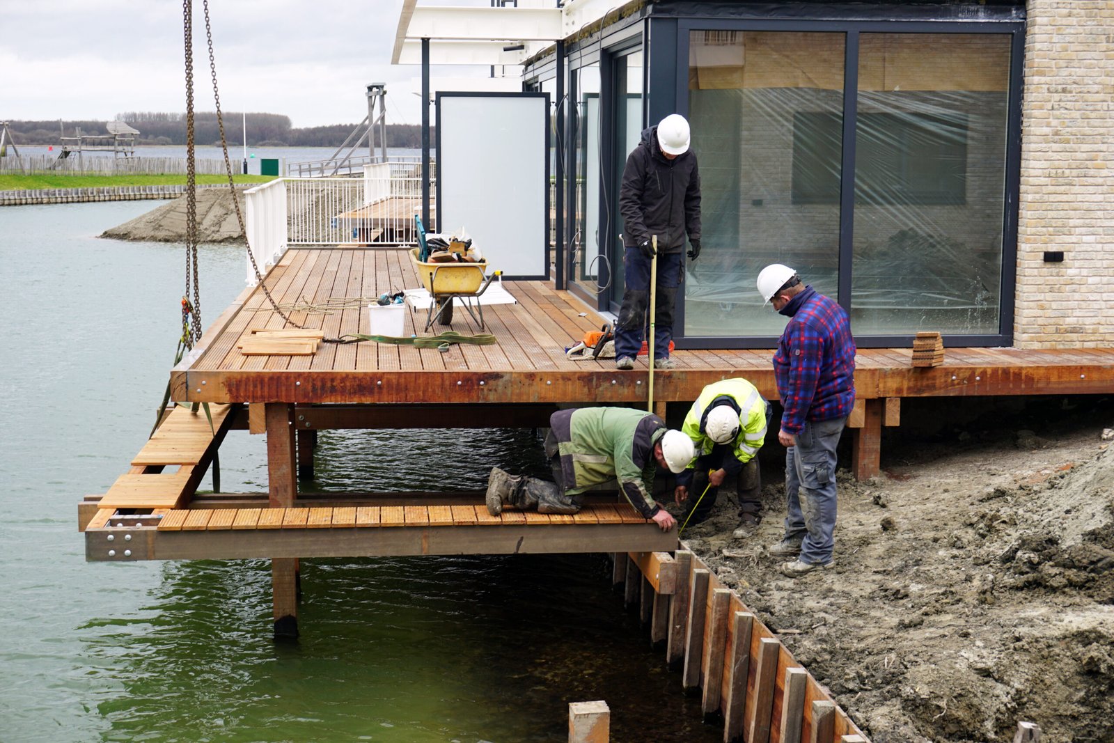 Langs de waterwoningen hebben wij de schriksteigers aangelegd. Deze zorgen voor een veilige en verzorgde afwerking van de waterkant en sluiten perfect aan bij het strakke en eigentijdse karakter van de woningen. Bij de uitvoering is rekening gehouden met duurzaamheid, functionaliteit en een nette uitstraling.