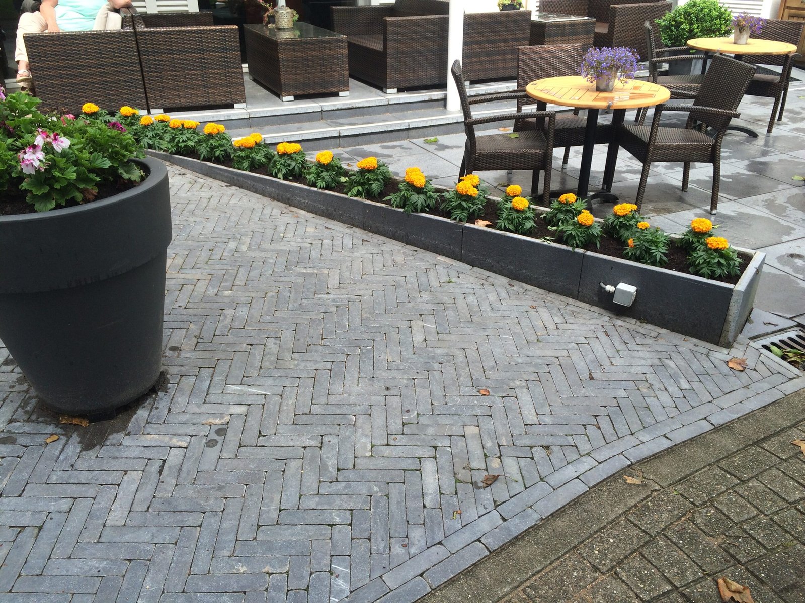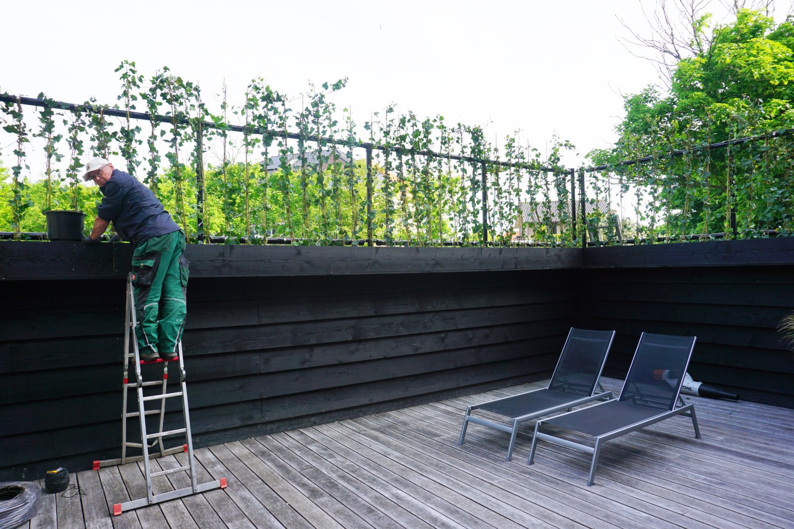 De klimop zorgt voor een zachte, groene uitstraling en past goed bij de omgeving van het hotel en de spa. Tegelijkertijd biedt deze oplossing extra beschutting voor gasten, zonder dat het gesloten of massief aanvoelt. De combinatie van hout en groen geeft de buitenruimte een rustige en verzorgde uitstraling.