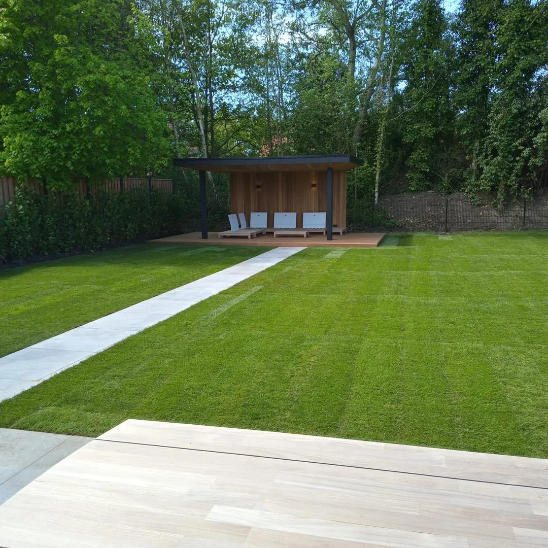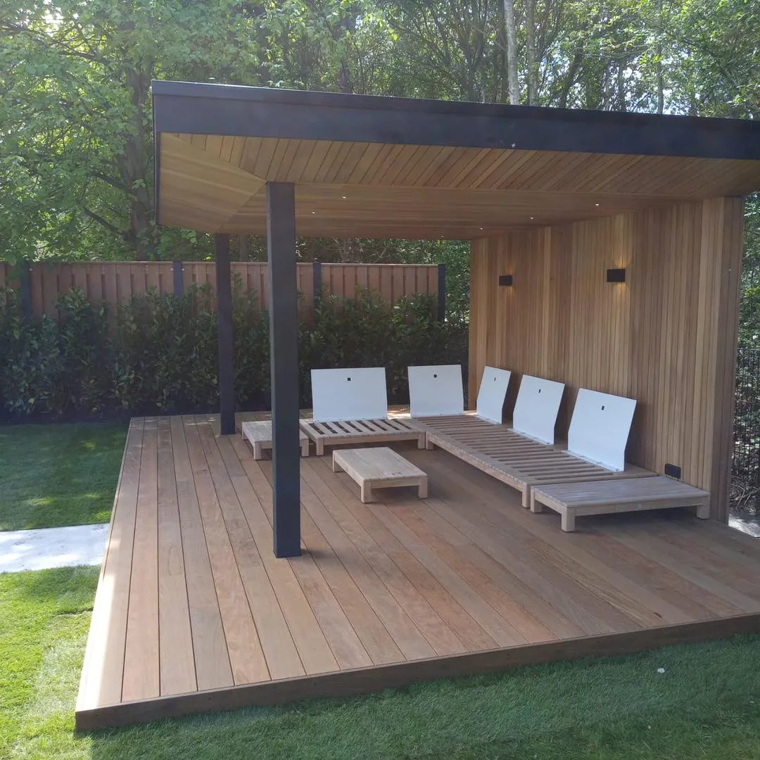 Door te kiezen voor IPE hout is een duurzame en luxe basis gecreëerd. Het warme karakter van het hout contrasteert mooi met de strakke lijnen van de overkapping en het omliggende groen. Het terras biedt volop ruimte om te ontspannen en maakt de overkapping echt onderdeel van de tuin.