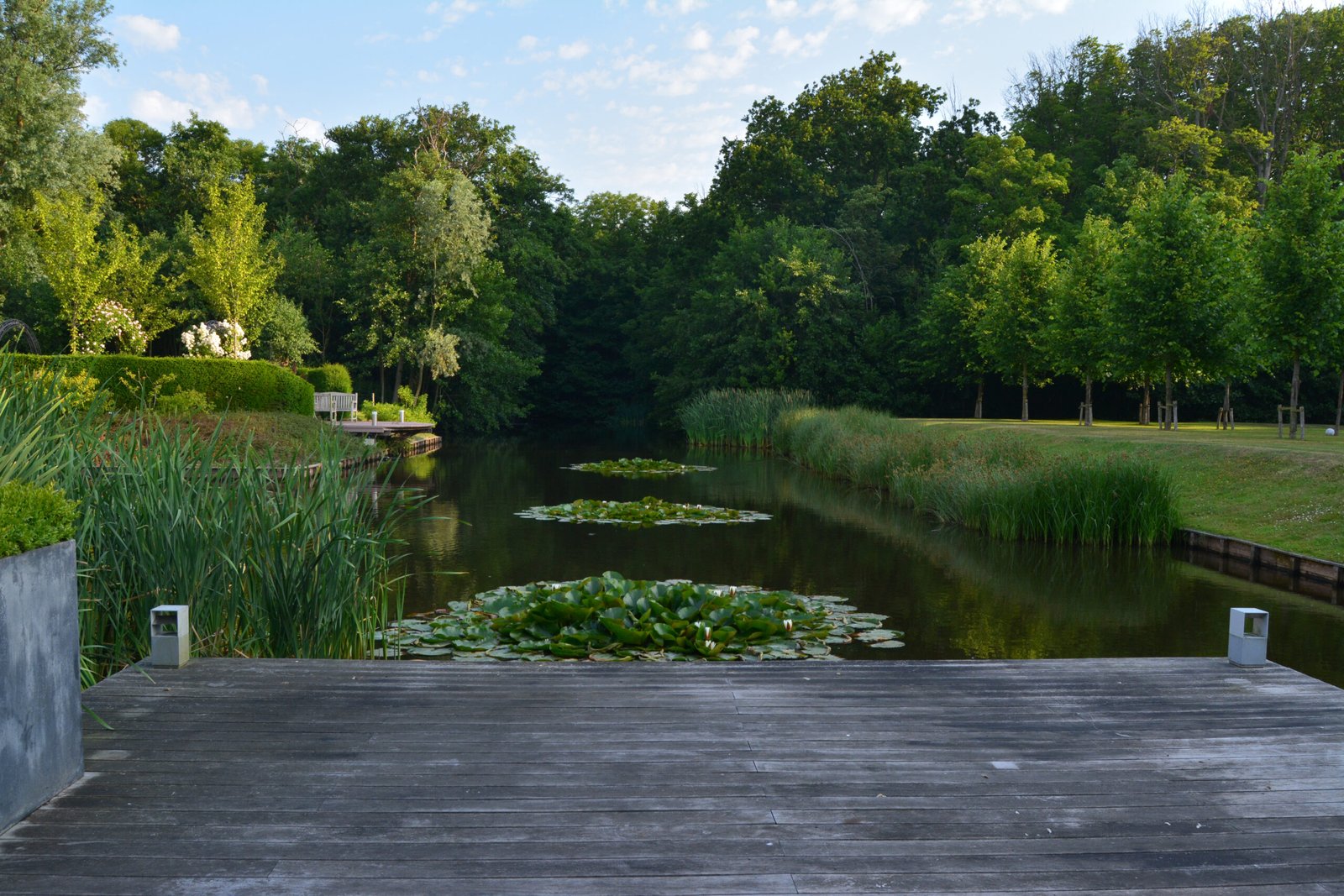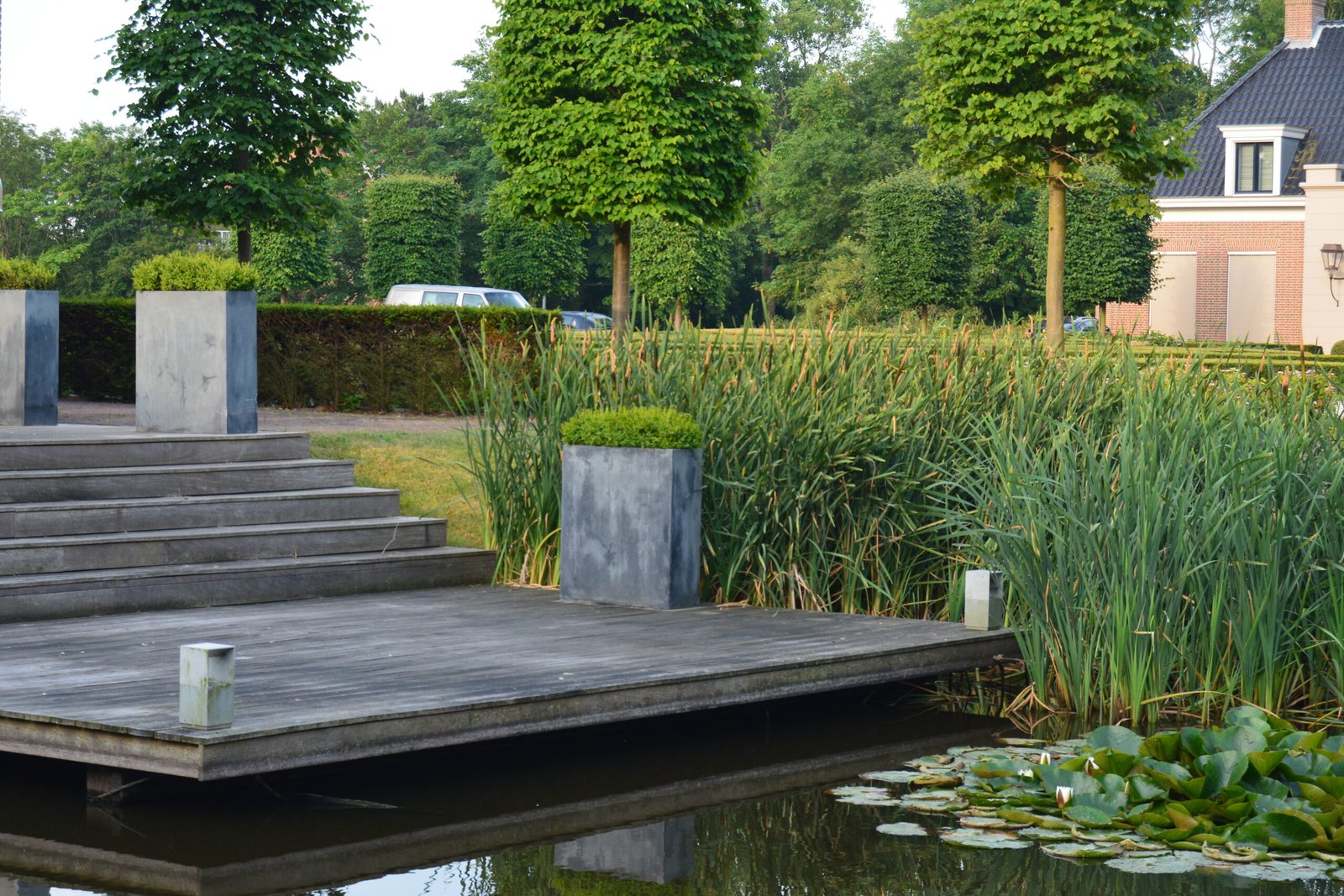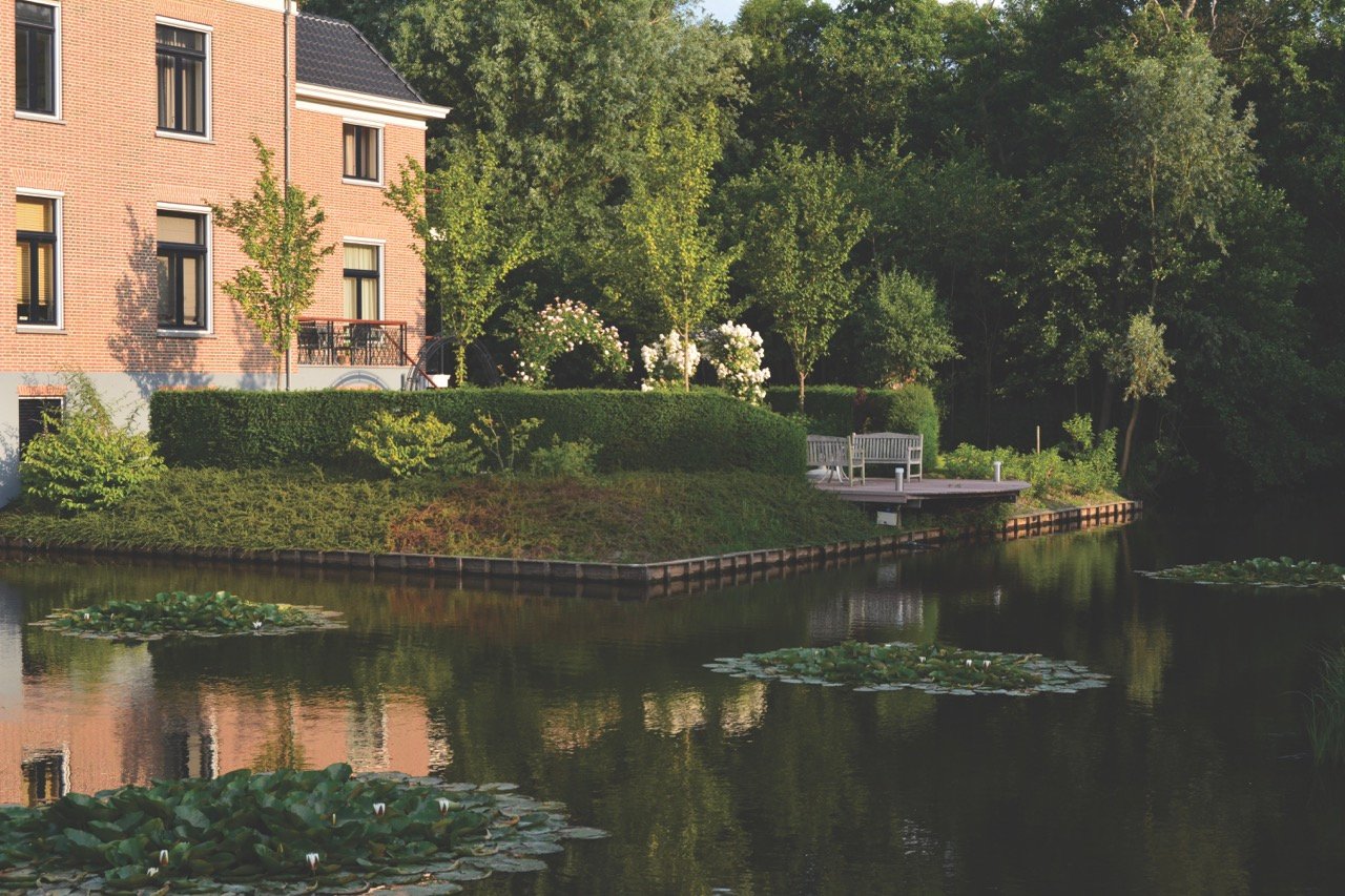 Het hart van de tuin is een royale vijver met waterlelies en natuurlijke oevers. De combinatie van water, rietkragen en rijke beplanting zorgt voor een serene sfeer en mooie reflecties van de woning en het omliggende groen. Steigers en terrassen aan het water bieden fijne plekken om te zitten en in alle rust van het uitzicht te genieten.