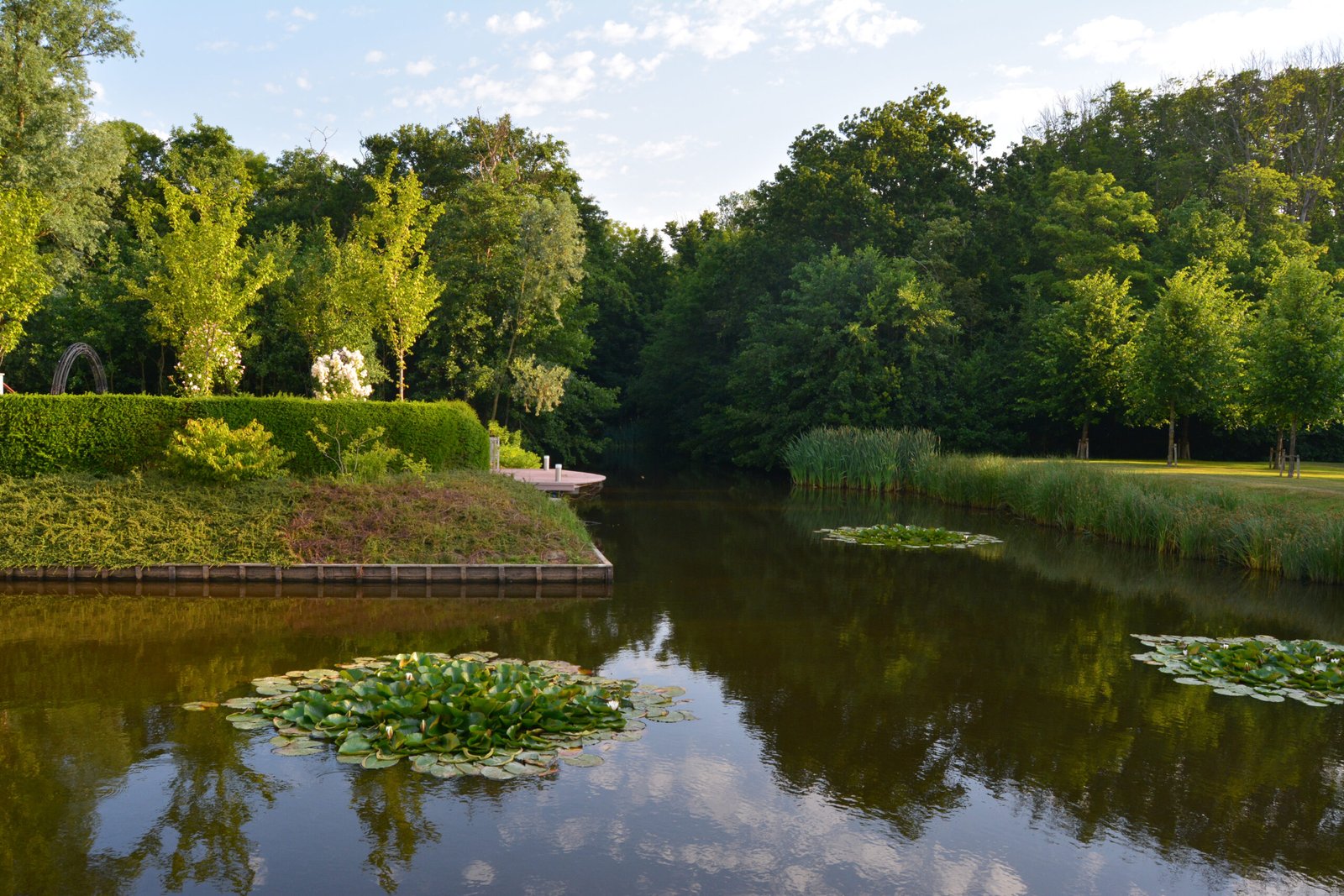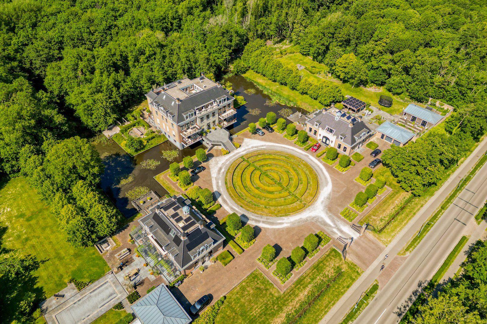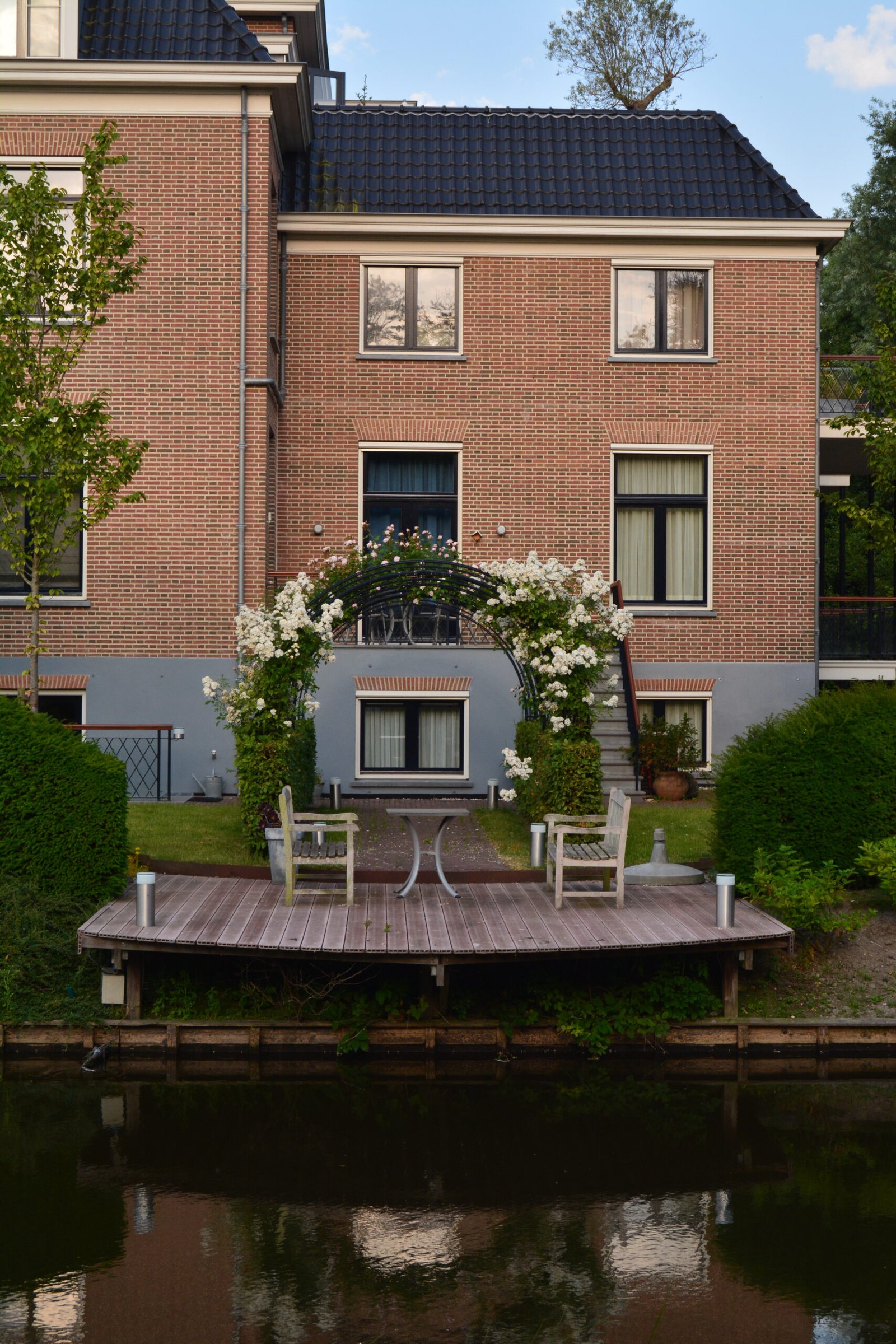 Het hart van de tuin is een royale vijver met waterlelies en natuurlijke oevers. De combinatie van water, rietkragen en rijke beplanting zorgt voor een serene sfeer en mooie reflecties van de woning en het omliggende groen. Steigers en terrassen aan het water bieden fijne plekken om te zitten en in alle rust van het uitzicht te genieten.