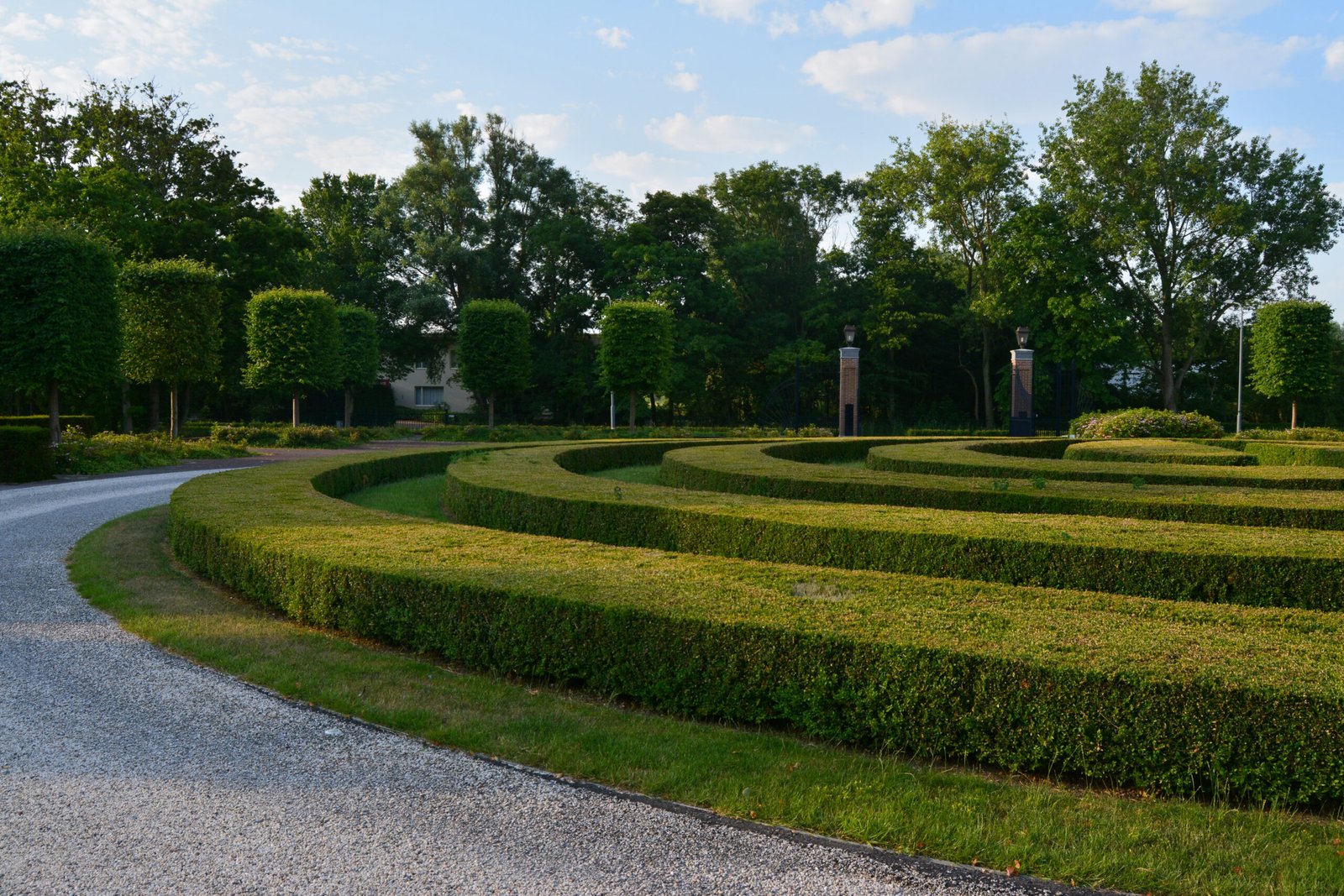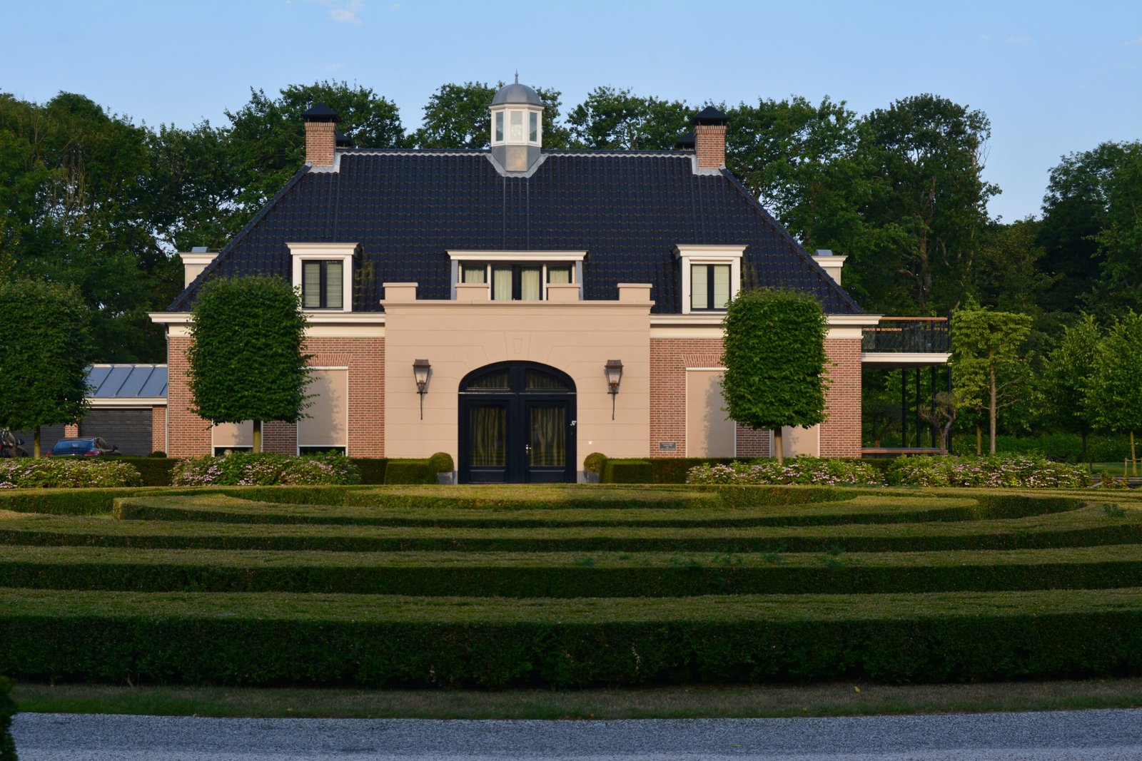 Aan de voorzijde trekt de strak geschoren haagstructuur direct de aandacht. Het doolhofachtige patroon geeft de tuin een klassiek en statig karakter. Samen met leibomen, vaste beplanting en ruime gazons ontstaat een harmonieus geheel waarin lijnen, zichtassen en groen perfect op elkaar zijn afgestemd.